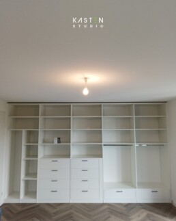 In het Gelderse Gendt voorzagen we deze lege muur van een schuifdeurkast m茅t spiegeldeur. Bij het ontwerp is er gekozen voor een handige combinatie van planken, lades en hangroedes.
